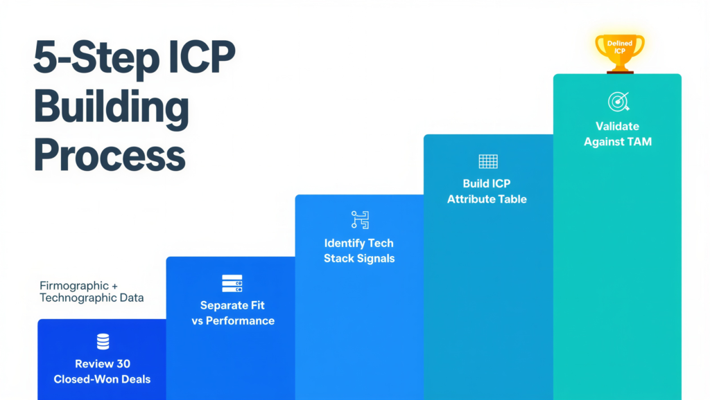 This process is built around one principle: every ICP attribute should be checked against your actual closed-won data before you include it. Attributes that feel right but don’t consistently appear in your best customers are assumptions, not ICP criteria.