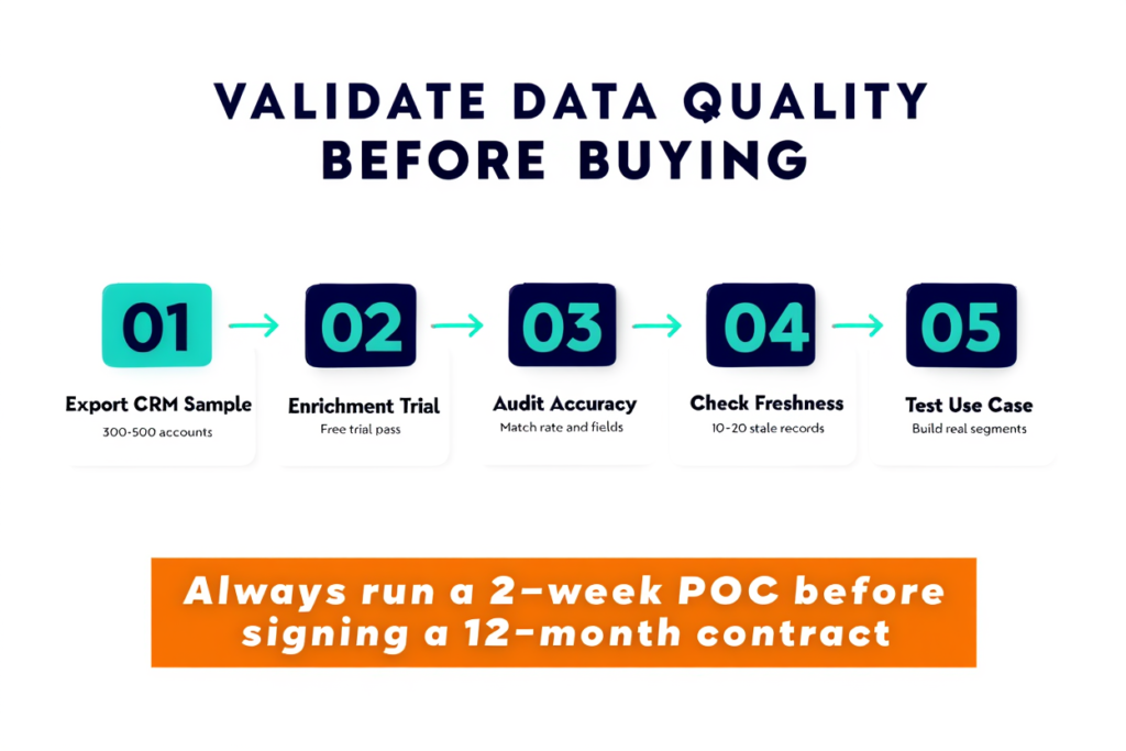 Step 5: Test your actual use case If you’re going to use the data for territory segmentation, build the segment you need in their platform. If it’s for lead scoring, see if the fields you need are populated at the rate you’d need.